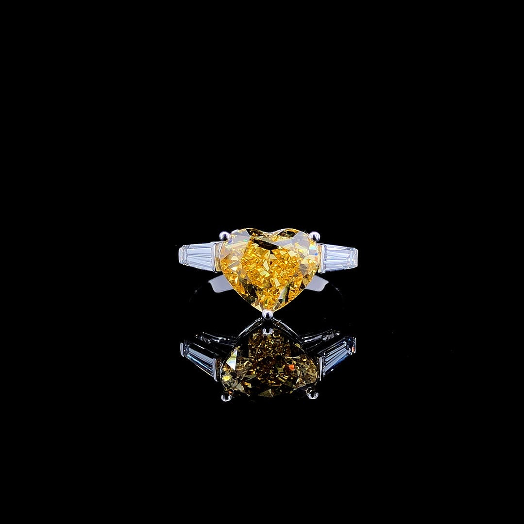 This captivating engagement or statement ring embodies romantic luxury with a radiant heart-shaped fancy vivid yellow diamond as its centerpiece, weighing approximately 2.50 carats and showcasing VS1 clarity for exceptional brilliance and fire without inclusions. Flanking the vibrant yellow heart stone are two tapered baguette-cut white diamonds (each ~0.25 ct, totaling 0.50 ctw), set in channel prongs to create a balanced three-stone design that elongates the finger and amplifies sparkle. Crafted in polished 18K white gold with rhodium plating for scratch resistance and enduring luster, the slim band (1.5–2mm wide) ensures comfortable all-day wear while highlighting the color contrast between the sunny yellow focal point and icy white accents.