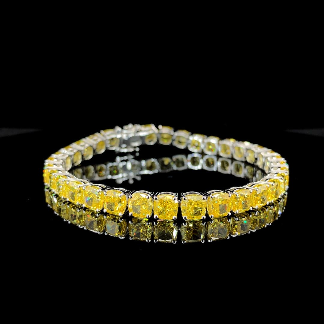 - Design: A classic single-row tennis bracelet with approximately 20–25 prong-set, square-shaped cushion-cut fancy yellow diamonds forming a continuous line around the wrist. The setting highlights the vivid yellow hue against a bright white metal for maximum contrast and sparkle. The clasp is concealed and diamond-accented for seamless elegance.